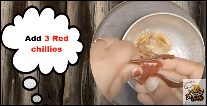 Step 6: Add 3-4 Red chillies after garlic is roasted and roast it lightly (as per spice level).