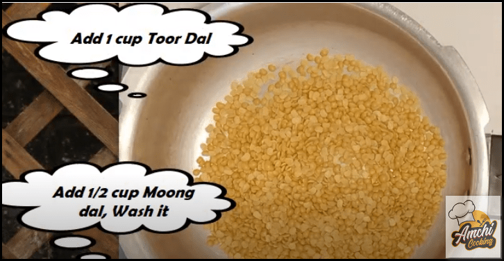 Step 1: Wash the half cup Moong dal and 1 cup Tuvar dal (split green gram and pigeon pea).