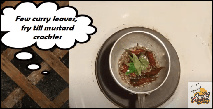 Step 9: Prepare seasoning: 1 spoon oil, 1 spoon mustard, 1 spoon jeera (cumin seeds, few curry leaves, 2-3 red chillies.