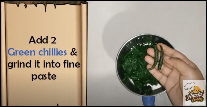 Step 2: Take half of the blanched palak and grind it to fine paste with 2 green chillies.