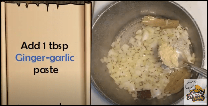 Step 5: Add 1tbsp Ginger garlic paste and roast till raw smell goes off.