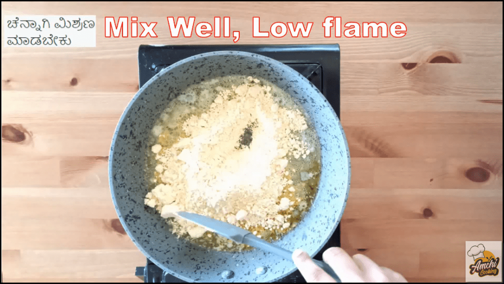 Indian sweet recipe using gram flour. The recipe is simple yet tastes heavenly. gram flour is called Besan in Hindi, ಕಡಲೆ ಹಿಟ್ಟು in Kannada and “Chana peet” in Konkani. This sweet recipe tastes too delicious. The pure ghee or melted butter in the recipe enriches the flavour. Nothing can replace the ghee in this recipe. This is North Indian style recipe which are prepared mainly during festivals, pooja/ Tulsi pooja/ Ganesh chaturthi festival time sweet. This laddu melts in mouth and you will not end with 1. This recipe can make 10 laddus (medium sized).