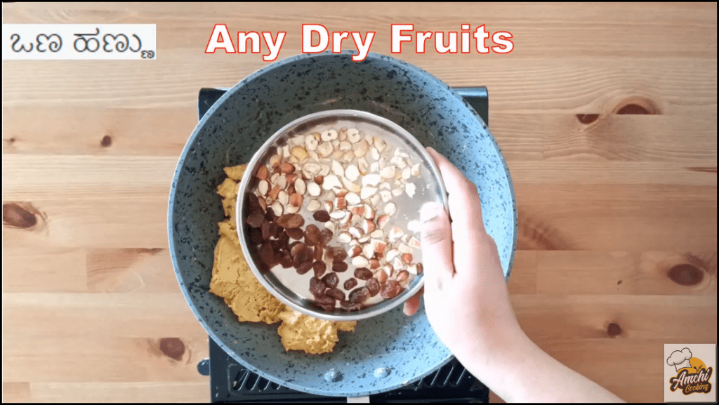 Step 8: When the mixture turns to paste texture, add the dry fruits chopped. Saute 2 min.