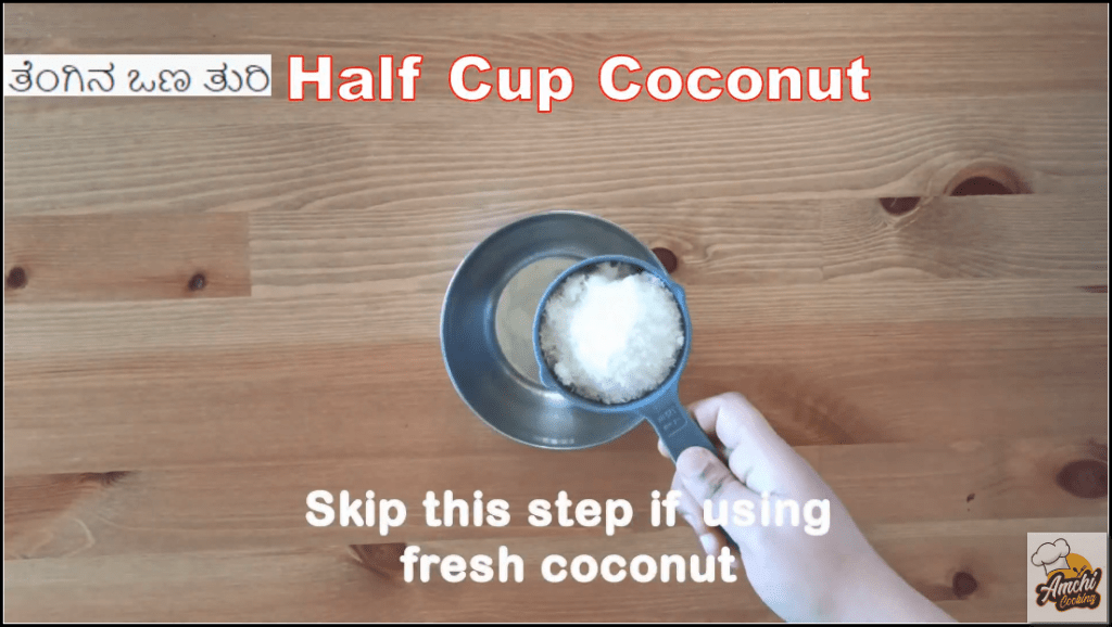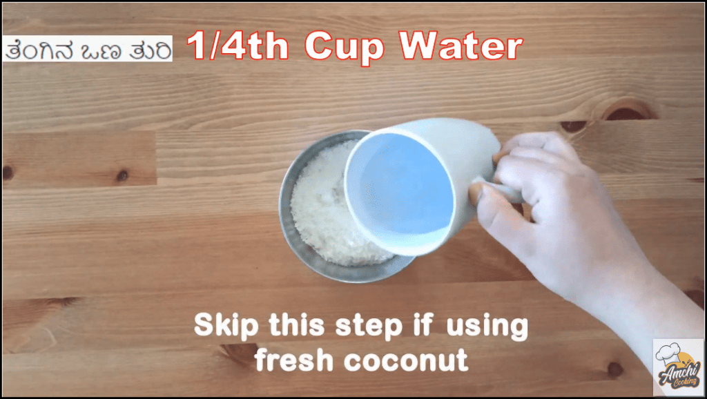 Step 1: Soak half cup dry desiccated coconut in 1/4th cup water (skip if fresh coconut).