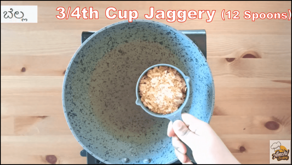 Step 4: Add 1 cup of jaggery (2 &1/2 piece or 12 tbsp) into a pan.