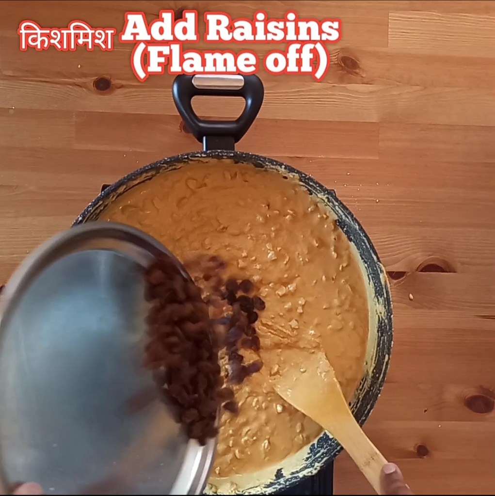 Step 7: Once the mixture turns to liquid paste, add the chopped cashews and almonds. Mix and saute for 3 more minutes. Switch off the flame then add few raisins. (adding dry fruits are optional).