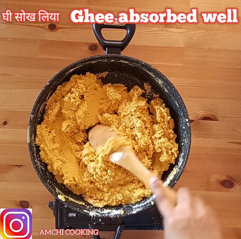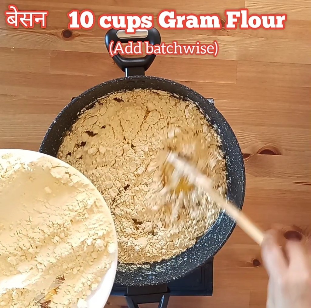 Step 5: Add 10 cups besan/ gram flour (batchwise; add little ghee if mixture turns dry).