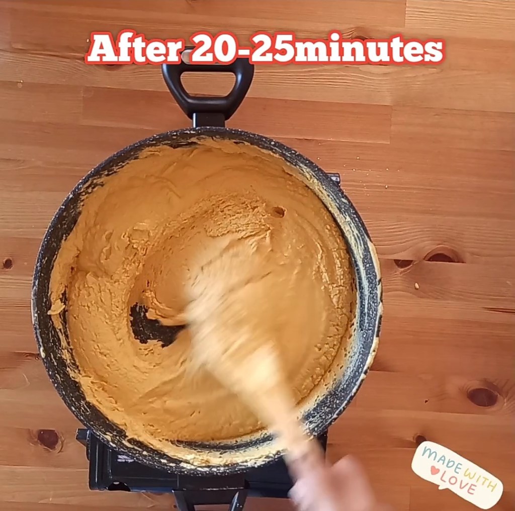 Step 6: Mix well and saute the mixture till the raw flavour goes off , till ghee releases and mixture turns to liquid texture (It took me 20-25 minutes for 10 cups flour).