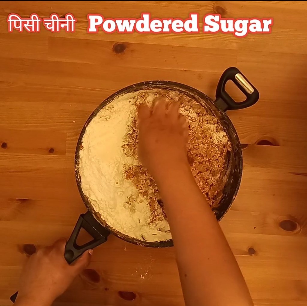 3. Mixing the powdered sugar well (after cooling the roasted paste).