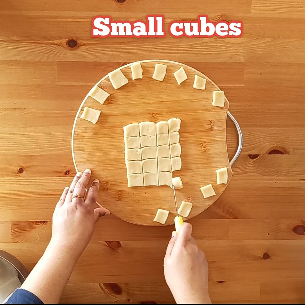 Step 8: Take a ball shaped portion and roll it thick. Cut it to square shaped dough.
