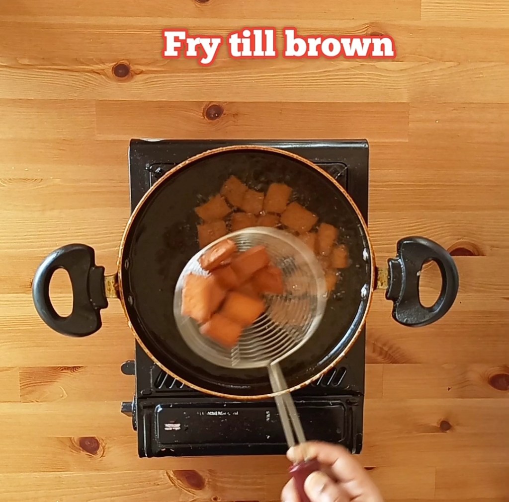 - Always fry it on low flame. If fried on high flame, it turns brown soon and inside it will be raw and soft.